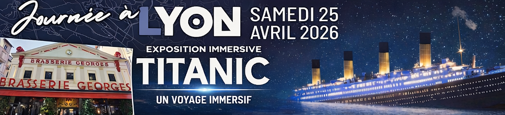 | Transport | Exposition immersive Titanic | Repas Brasserie Georges | Après-midi libre | Tarif adulte | Tarif enfant (6 – 18 ans) | Tarif adulte extérieur | Tarif enfant extérieur | |